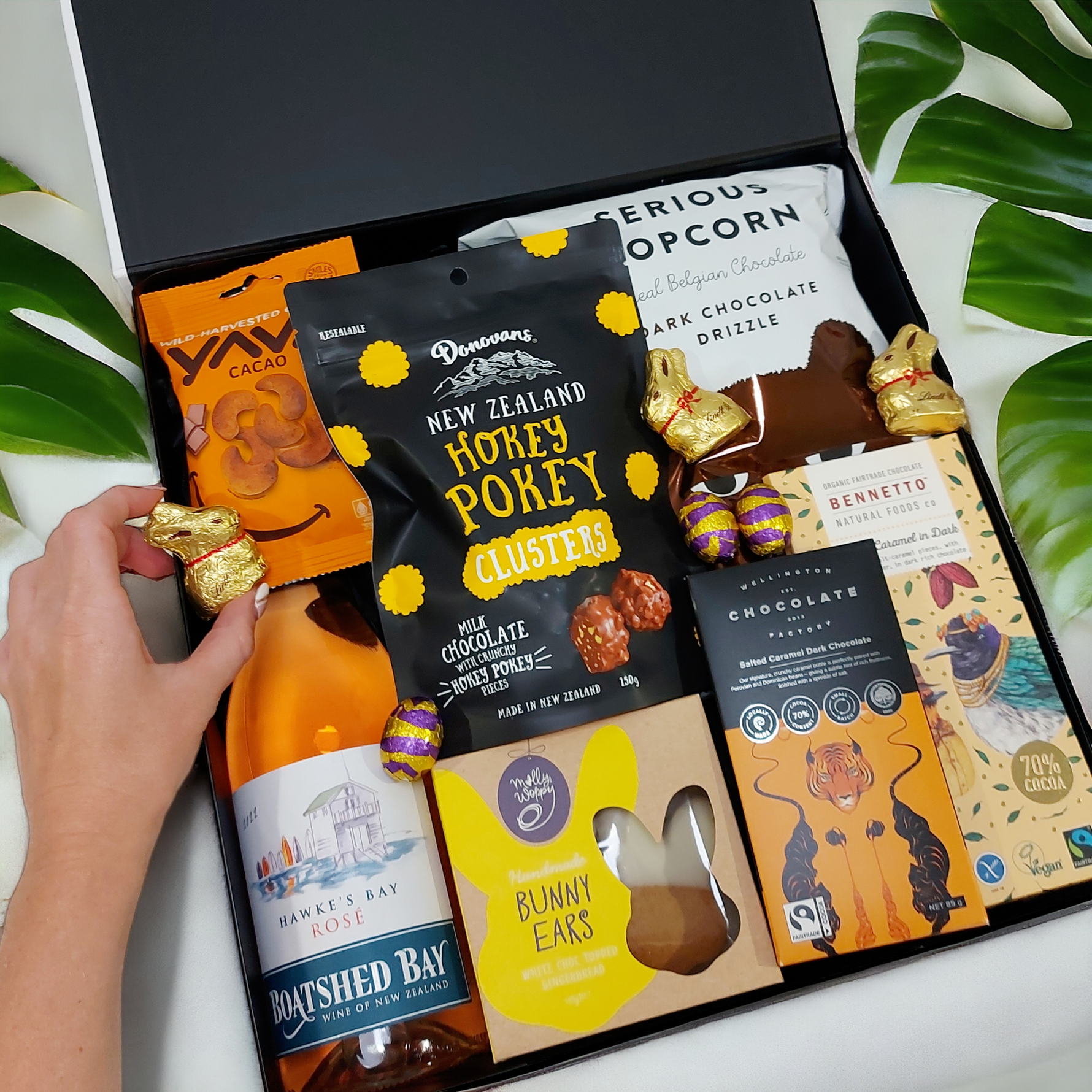 Easter Essentials Gift Box! It’s loaded with gourmet goodies, irresistible chocolates, and a sip of something special to toast the long weekend. With everything from dark chocolate popcorn to cute Lindt bunnies and premium wine, it’s the perfect surprise for someone you love, or a cheeky treat for yourself. Easter indulging sorted!