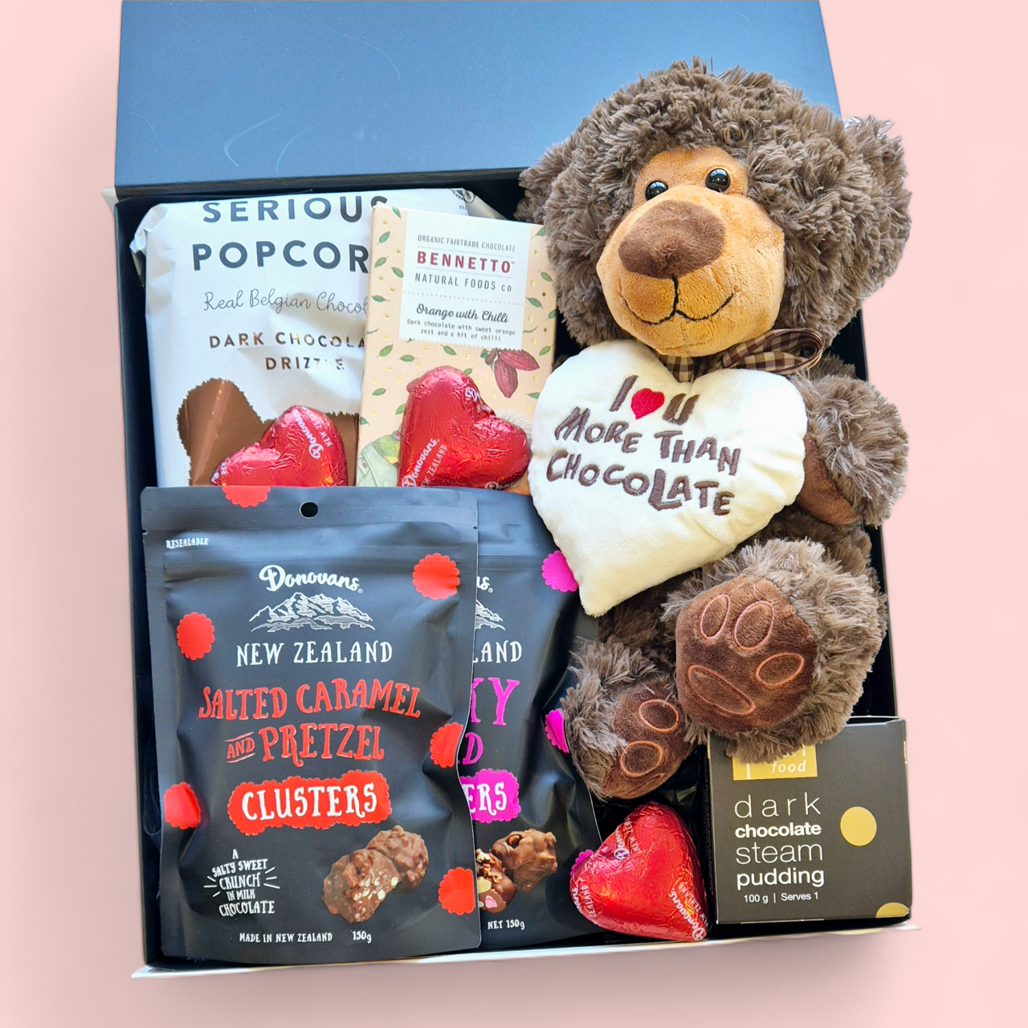 Unit price perShow your love this Valentine’s Day with our You're the Chocolate to My Heart gift box. Featuring a cute teddy bear that says, 'I love you more than chocolate,' this romantic gift set is packed with all things chocolate. Enjoy moreish chocolates, a luscious chocolate steam pudding, and chocolate-drizzled popcorn – the perfect indulgence for your special someone. Whether for your partner, spouse, or loved one, this heartfelt Valentine’s Day gift is sure to make their heart melt.
